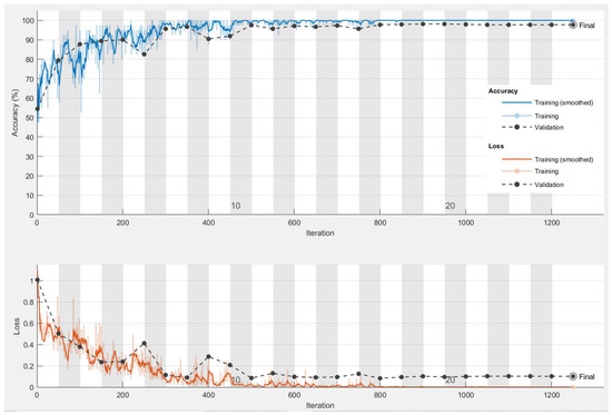 With SGDM, the weights of the network are updated according to the estimation error. Equation (3) is used to update the weights. With this equation, the weights are updated according to the loss function (). In order for the error value to decrease after each update, the loss function is moved in the direction of the negative gradient. The speed of this movement depends on the learning rate (). The contribution of the current weight value to the weight value in the previous iteration is determined by the Momentum () coefficient. The values of α and γ parameters in Equation (3) are shown in Table 1.