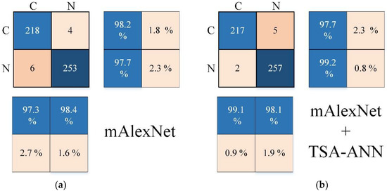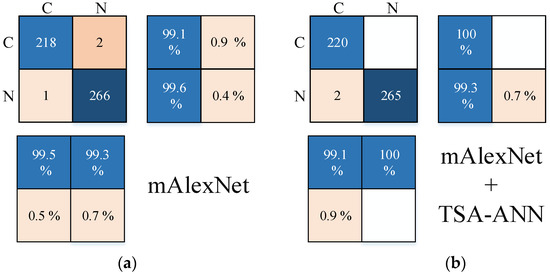 Confusion matrices of proposed models. (a) mAlexNet; (b) mAlexNet + TSA-ANN.
