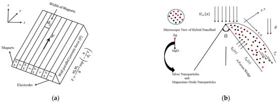 Let us assume a steady, two-dimensional, boundary layer flow of a hybrid nanofluid over a vertical permeable contracting/expanding Riga wedge in the presence of slip and the combined effect of the free and forced convection. The water-based Ag-MgO hybrid nanofluid and heat transfer schematic flow configurations of the current model are more clearly manifested along with the Cartesian coordinate system for the three different geometries are demonstrated in Figure 1a,b. It is more precious to mention that the three different geometries surfaces such as stagnation point, wedge, and flat plate are treated as Riga plates for the considered flow symmetry. Moreover, it is presumed that the thermophysical properties are constant, but the density differences caused by temperature gradients are taken into account. It is presumed that the contracting and expanding vertical wedge has a variable velocity, , while the velocity at the free stream is dignified by . Whereas signifies the variable temperature at the wall surface of the wedge, while the ambient or free stream takes the constant value and is denoted by . Far away from the surface of the wedge plate, both the Newtonian absorbing fluid and the surrounding fluid are maintained at a uniform temperature . Moreover, at the cooled surface condition when the variable temperature is less than the ambient temperature such as corresponds to the buoyancy opposing flow at the heated surface condition when the variable temperature is superior to the free-stream temperature such as corresponds to the buoyancy assisting flow. It is further assumed that the mass flux velocity is denoted by , where corresponds to blowing or injection and corresponds to suction. Under the aforementioned stated proviso, the requisite leading governing equations following are as follows: