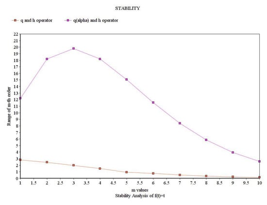 In Table 2, we list the values of Examples 7 and 8 for . For simplicity, we denote the th order of operator by and the th order of operator by . In addition, the stability between and operators is given in Figure 3.