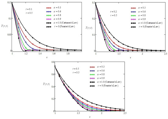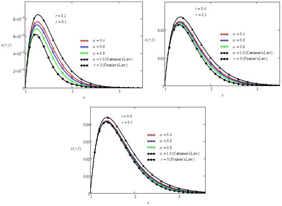 The variation of the dimensionless temperature , for small values of time and for different values of the fractional parameter are shown in Figure 2. The temperature profiles were drawn for three cases corresponding to the fractional mathematical model but also for the classic cases of thermal transport Cattaneo, respectively Fourier.