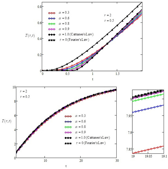The time variation of the nondimensional temperature is shown in Figure 3. As we discussed results obtained in Figure 2, it is more clearly in Figure 3 that the memory effects have different influences for small values of time, respectively large values of the time t. It is observed in Figure 3 that at small values of the time t, the fractional Cattaneo’s law leads to higher temperatures than that corresponding to the classical Cattaneo’s law, but, for large values of time, the fractional models generate the smallest temperatures. Moreover, for high values of time t, the temperature field tends to have a constant value. This value is the same for all the analyzed models. On the one hand, this property results from numerical simulation, but it can also be justified theoretically using the following property: