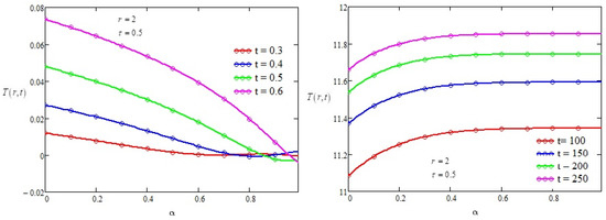 Let’s note that for and , the solutions (32) and (33) give the temperature field corresponding to the generalized fractional Cattaneo thermal process. If and , Equations (32) and (33) give the temperature of the classical Cattaneo thermal process. For , Equations (32) and (33) are the solutions of the thermal process described by the classical Fourier’s law.