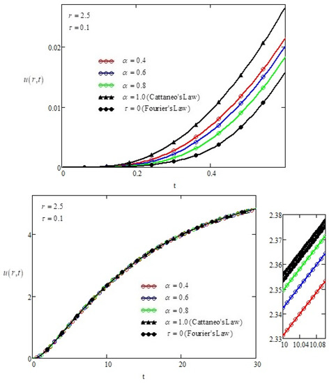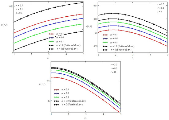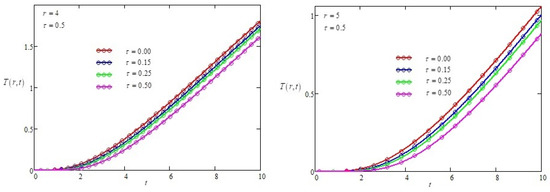 The variation of dimensionless temperature with the fractional parameter is shown in Figure 4. It is seen in this figure that the temperature is increasing with the fractional parameter. However, for high values of time, the influence of the fractional parameter on the temperature is insignificant. This is due to the time evolution of the fractional kernel that decreases to zero when .The influence of the thermal relaxation time on the thermal field is shown in Figure 5. It is seen that the temperature decreases with the relaxation time .