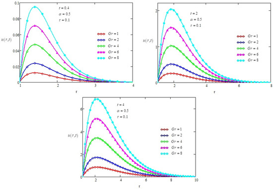 Fluid motion is analyzed by the graphs in Figure 6, Figure 7, Figure 8 and Figure 9. Figure 6 shows the velocity profiles versus the radial variable r, for different values of the fractional parameter . It is observed that there is a perfect correlation between the evolution of fluid temperature and velocity concerning the memory parameter , namely, the velocity values decrease with the memory parameter . On the other hand, the velocity has a maximum value near the cylindrical surface and tends to zero away from it.