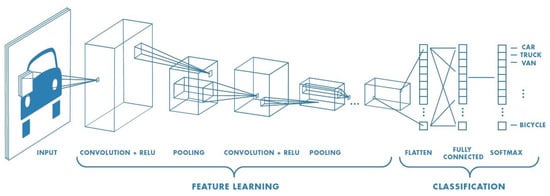 Convolutional networks are special types of neural networks designed to work well with two-dimensional data, such as images and media []. As shown in Figure 1, a CNN is structured into several convolutional layers that process an image or other two-dimensional input to discover important information such as edges and corners []. The distinction between important and unimportant information is decided by the activation function. That information is provided to the pooling layer, where the spatial size of the convolution is reduced while summarizing and maintaining the important details about the convolution. This, in turn, reduces the computational power needed to process the data because there is less information to process. This is achieved by one or more of several types of pooling functions, such as average and max pooling.