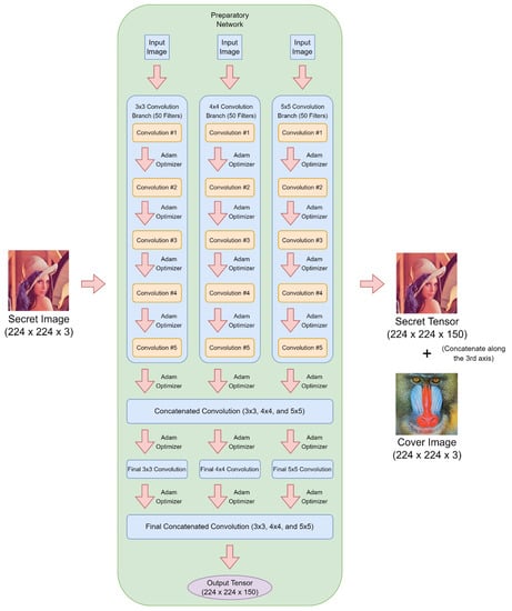 As shown in Figure 2, the preparatory network preprocesses the secret image before the embedding takes place. The preparatory network consists of five two-dimensional convolution layers, with each convolution layer having fifty filters each of 3 × 3, 4 × 4, and 5 × 5 patches. Each patch has a kernel size of five and has a ReLU activation function. The output of the preparatory network is a secret tensor with the dimensions of 224 × 224 × 150. By convolving the secret image with the operations in the preparatory network, the dimensionality of the secret image is expanded, thereby allowing the hiding network to select the most important features for the hiding process. As illustrated in Figure 3, the secret tensor is fed into the hiding network along with the cover image to produce the stego-image, which is then sent to the reveal network that reproduces the secret image. Both the hiding network and reveal network have the same structure as the preparatory network. Before the images are provided to the network, they are first rescaled to 224 × 224 pixels. Each image is full-color, with each color channel occupying eight bits per pixel.