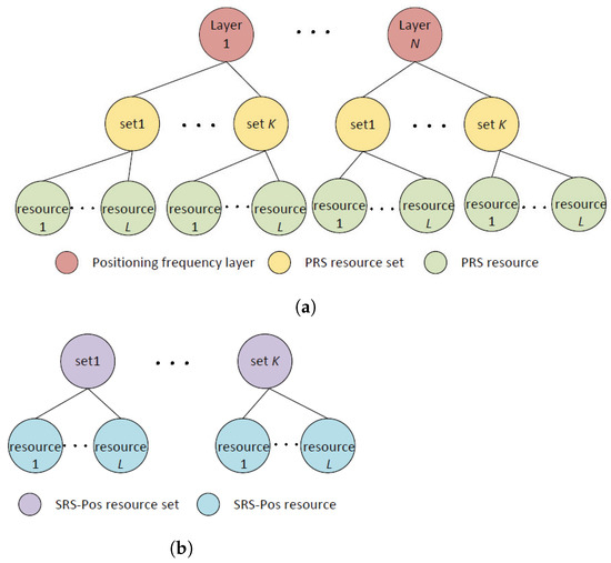 In the DL positioning technology scheme (mainly based on DL-TDOA or DL-AoD), and the uplink-downlink joint positioning technology scheme, UE obtains the measurement value by detecting the PRSs from multiple base stations or transmission/reception points (TRPs). As a tradeoff of signaling overhead and flexible resource allocation under multiple TRP non-colliding transmissions to position a device, NR uses a hierarchy with positioning frequency layers, PRS resource sets and PRS resources to define the structure, as shown in Figure 1a. One positioning frequency layer consists of one or more PRS resource sets across one or more TRPs, all with the same carrier frequency, subcarrier spacing (SCS, i.e., OFDM numerology), PRS bandwidth and so on. A PRS resource set contains at most two PRS resources originating from the same TRP, and parameters comprising PRS repetition factor, resource offset, etc., are identical. Each PRS resource typically corresponds to a beam from the TRP. Then, by configuring a device to measure on a certain PRS resource from a PRS resource set, the location server obtains knowledge not only about which TRP the reported measurements correspond to, but also the particular beam from the TRP.