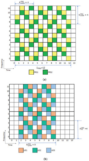 Further, to allow simultaneous transmission of multiple PRS, a comb-based transmission is designed. is the frequency granularity of PRS resources, i.e., the PRS utilizes every th subcarrier. Then, one device should listen to multiple TRPs for positioning. Figure 2a shows an example of PRS time-frequency resource element (RE) mapping under a comb-based design with and .