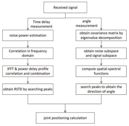Based on the received signal in (3), the signal detection for delay and angle under the joint positioning algorithm can be performed according to the following subsections. The algorithm process is shown in Figure 4.
