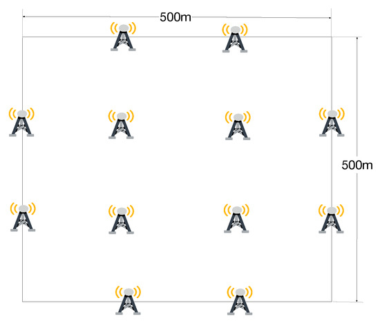 Unless specified otherwise, the simulation setting is given in Table 3. Take an indoor square factory with 500 m × 500 m [1], in which devices are uniformly distributed. There are 12 TRPs within the factory, and 3 TRPs perform the measurement for a target device by default. The network is a TDD system operating in 27-28GHz with a subcarrier spacing as 120 KHz and a 400 MHz bandwidth. The simulation scenario is shown in Figure 6.