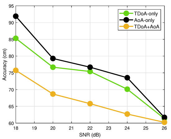 One thing to declare is the accuracy is obtained by a 1% error estimation of delay and angle, i.e., working SNR, is 22 dB, as shown in Table 3. It can be found that the accuracy is limited to around 60 cm. The main reason is the system setting of 120 KHz and frequency range restricts the positioning accuracy, as shown in (8). Until now, the testing or simulation for 5G positioning has been quite different, and this paper compares the performance with results in [15] wherein the localization is based on time estimation measurement. It could be found that the joint positioning method can improve the localization accuracy to submeter around 27 GHz. However, it should be also noted that the performance enhancement is at the cost of increased computation complexity. According to (15) with and corresponding to a angle searching granularity, and system parameters in Table 3, the processing complexity under the joint positioning is around 3.2× and 1.4× of that under the TDOA only and AoA only. According to the positioning accuracy specification in [1,10], the requirement is down to 10–20 cm for indoor positioning. Therefore, we think the complexity is worth the increased accuracy.