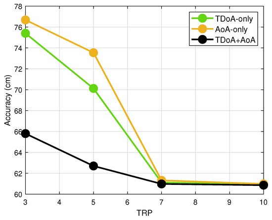 Moreover, the performance impact of TRP number on the positioning accuracy is illustrated in Figure 10 with a working SNR as 22 dB. There is no doubt that better positioning accuracy can be obtained under the joint positioning method, and the accuracy can be improved by around 13%. With the increase in TRP numbers, the performance gap decreases. While the TRP number is larger than seven, there is basically no difference between the three methods.