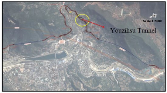 Currently, the support parameters design of the highway tunnels in China is fundamentally based on the surrounding rocks’ grade [36]. The categorization of the grade of the surrounding rocks depends on a number of factors, such as rock integrity and hardness, structural plane, and groundwater. However, the total length of the Youzishu tunnel is 1906 m, including 1476 m in the Grade V section, 370 m in the Grade IV section, 60 m in the Fracture Zone, and 1254.3 m3/d in normal water inflow. The net width and net height of the main tunnel are 11.5 m and 9.75 m, respectively. The slope and the side of the tunnel entrance are unstable structures, and there is a risk of collapse during construction. The silty clay and crushed stone soil cover the entrance and exit of the tunnel, the soft rock is the main surrounding rock in the cave body, and it is easy for it to collapse and experience water gush under bad geological conditions.
