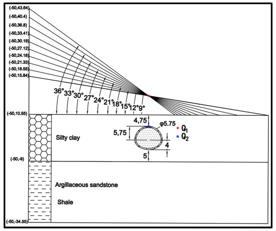 In the numerical calculation of FLAC3D, the mechanical model of the material is based on the elastic, perfectly plastic Mohr–Coulomb model, while the elastic model is used for the concrete tunnel lining. The model has two strata, the first layer is mainly silty clay and is judged to be Grade V surrounding rock with a thickness of 24.84 m (For group 1), and the second layer is mainly argillaceous sandstone and shale, which is determined to be Grade IV surrounding rock, and its thickness is 25.55 m. The parameters of Bulk Modulus (), Poisson’s ratio (), cohesion (C), and Friction angle () are defined. The Bulk Modulus (), Elastic Modulus (), and Shear Modulus () can be converted by Poisson’s ratio () as the following equations [35]: