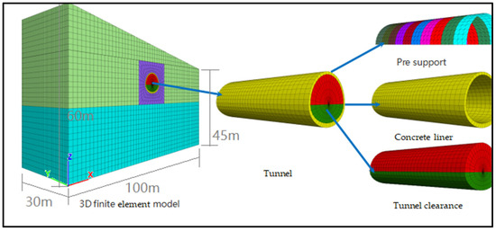 The model is located in a section near the exit of the tunnel, where the geological topography is shallow and rich in water, the surrounding rock is soft, and there are fault fracture zones, which are prone to collapse and water and mud gushing. Figure 5 shows the developed 3D model using FLAC3D. The mesh used in this model consists of 50,251 nodes and 47,040 elements. The dimensions of the model are 100 m in the transverse direction and 60 m in the vertical direction, that is, the calculation boundary of the left and right sides is four times the total tunnel span, the calculation boundary of the lower side is three times the total tunnel height, and the excavation depth is three times the tunnel diameter, that is 30 m. In the vertical direction, the deep side is 60 m, the shallow side is 45 m, and the left-high right-low bias terrain is formed. The tunnel’s buried depth is 12 m, which is a shallow tunnel. Therefore, these dimensions are sufficiently large to eliminate the effect of boundary conditions on the numerical results, because the massive raise in the stratum size does not lead to any change in the analysis results. In this model, the boundary conditions are set as follows: the top side is a free surface; the four side surfaces restrain its normal displacement; and the bottom surface restrains the displacement in three directions. In this model, the shell element is used for the initial support, and the groundwater seepage is considered, the groundwater level is parallel to the mountain terrain, the groundwater level is set by the water table, and the tunnel excavation and lining are considered to be impermeable structures.
