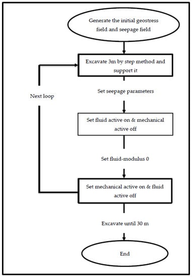 It is worth mentioning that, when calculating the fluid–solid coupling effect of rock and soil mass, the rock mass should be regarded as a porous medium. The flow of fluid in the porous medium is based on Darcy’s law and Biot’s equation, additional parameters, such as porosity and permeability of the material, are defined. There are four types of seepage boundary conditions to choose the fluid–solid coupling model, including the given pore water pressure, the given normal flow rate outside the boundary, the permeable boundary, and the impervious boundary. In the analysis process, the mechanical calculation time is much longer than the coupling diffusion time, so a single seepage analysis, that is, a drainage analysis, can be performed. It is well-acknowledged that the soil is considered an incompressible granular material. The parameters involved are Permeability Coefficient (), Density of Water , Gravity (), Biot Coefficient (), Bulk Modulus () and porosity (). In this case, the Permeability Coefficient is of the same nature as the Pressure Coefficient in Darcy’s law, and is related to the Hydraulic Conductivity (), using Equation (4) [: