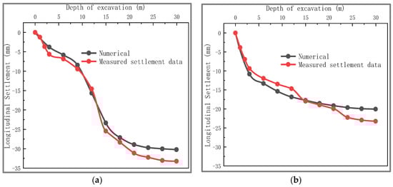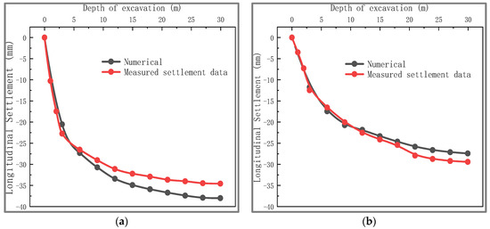 The longitudinal settlement of points (a) Q1-0 and (b) Q2-0.