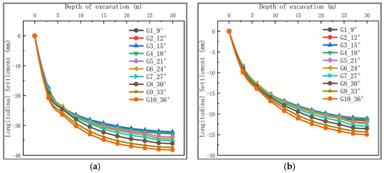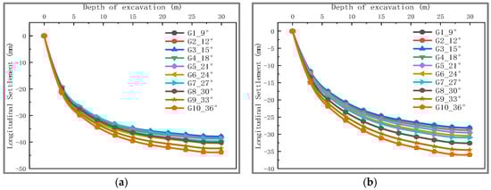 Otherwise, when considering the fluid–structure interaction, as shown in Figure 10, the vault subsidence increases by 15.5%, and the surface subsidence increases by 28.4%, which indicates that when the groundwater is considered, the influence of the bias angle on the surface is greater than that of the vault.