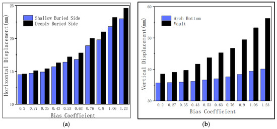 (a) Maximum horizontal displacement (absolute value) of deeply buried side and shallow-buried side under 10 different bias coefficients; (b) Maximum vertical displacement (absolute value) of vault and arch bottom under 10 different Bias Coefficients.
