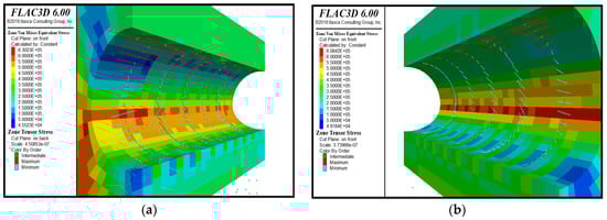 Figure 12 shows the distribution of the equivalent stress of the tunnel-surrounding rock and the distribution of the principal stress. The green short line represents the intermediate principal stress tensor, the red line represents the maximum principal stress tensor, and the blue line represents the minimum principal stress tensor. These quantities can represent the failure criterion of the material; the larger the structure, the more unstable it is.