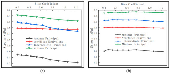 The maximum, intermediate, minimum principal stresses tensor, and Huber–von Mises stress under 10 different bias coefficients for (a) deeply buried side; (b) shallow-buried side.