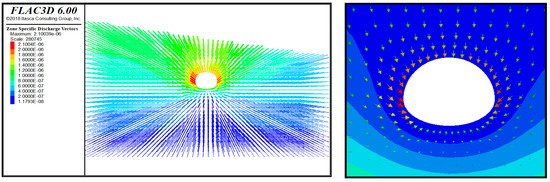 Figure 14 describes the distribution of Flow Vectors around the tunnel. It can be noted that the seepage vector distribution of the entire model, as well as the size and direction of the seepage vector around the tunnel, can be seen. In addition, it can be determined that the most likely location of the water seepage in the tunnel is at the arch waist on both sides, and that the deeply buried side arch waist is the most dangerous.