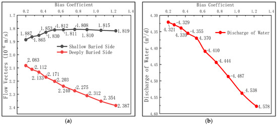 (a) The maximum flow vectors under 10 different bias coefficients for both shallow- and deep-buried sides; (b) The water flow in the tunnel per linear meter.