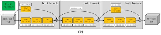 DeepLabCut is an open-source system for single-target pose estimation. Based on transfer learning, it can accurately detect keypoints without large quantities of training data, and has been tested and calibrated across species of mice, flies, and humans. The structure of the algorithm is shown in Figure 2. Its backbone network is Resnet50, which has been pre-trained in ImageNet [25]—a large target-recognition image database—eliminating the need for a large number of training samples. Unlike the standard Resnet50 network, DeepLabCut limits the downsampling multiple of the Resnet50 network to 16 times in order to obtain a larger feature map size. Specifically, the positions of Block2, Block3, and Block4 in Figure 2 are not downsampled, and Block represents the residual block in Resnet50.