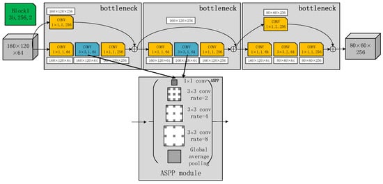 Application of the ASPP module in the residual network: The arrows represent 3 × 3 convolution kernels, with a convolution step of one in the block replaced by the ASPP module. The ASPP module consists of one 1 × 1 convolution, three 3 × 3 dilated convolutions with different expansion rates, and global average pooling. All feature maps were fused by using concatenation.