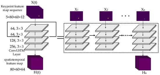 ConvLSTM network architecture: The ConvLSTM network consists of four ConvLSTM layers and a classification layer, where each layer has a convolution kernel of size 3 × 3 and a step size of one. The information on the previous moment can flow to the next moment in the network, and the final output contains the spatiotemporal information of the sequence of keypoint feature maps.