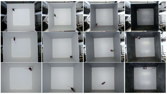 In this study, a dataset containing four keypoints representing the mouse’s nose, left ear, right ear, and tail root was produced, which was taken from the top in an open-field experimental box, with an image resolution of 640 × 480. The video was shot in a dark room using the same device, using fill lights to fix the light intensity at 200 lux. In total, 24 videos were captured, each of which was 5 min long and featured two mice. The videos were shot at different heights and with different background colors. The dataset comprehensively considered the influence of behavior, color, and scale on model performance. It included five behaviors (walking straight, resting, grooming, standing upright, and turning), four background colors (white, light gray, dark gray, and black), and three shooting heights (60, 70, and 80 cm). Figure 5 shows images from the dataset. There were 2700 images in the training set—including only the scale of 70 cm, with a uniform distribution of colors—and 1200 images in the test set, with uniform distribution of colors and scales. Each image was split from the videos above and randomly assigned to the training set or test set.