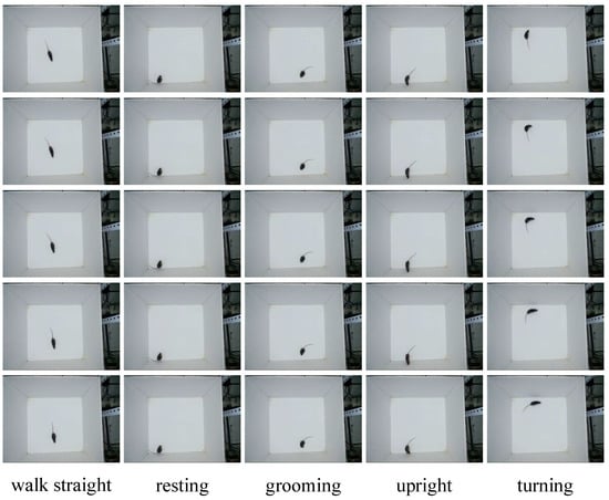 For the behavior recognition task, to ensure consistency of spatial scale, the videos were collected at a height of 70 cm. The behavior recognition dataset contained five types of behaviors: walking straight, resting, grooming, standing upright, and turning. Each type of behavior was represented by 600 labeled images, of which 75% were randomly selected as the training set and 25% as the test set. All stages of a given behavior were covered as much as possible in the labeling process. During training and testing, an image sequence consisting of the annotated frame and several frames preceding the annotated frame was used as an input to the model. Figure 6 shows an example of an image sequence of the five types of behaviors, in which the sequence length is five and the interval between frames is two.