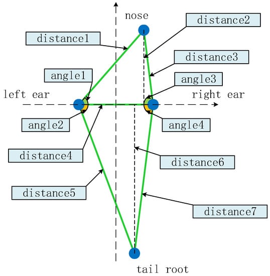 In the murine behavior recognition task, 3DCNN [33,34], LSTM, and Bi-LSTM [35,36] were compared with ConvLSTM. The 3DCNN network also used the keypoint feature map sequence as an input. This study used a four-layer 3D convolution; the numbers of convolution kernels were 64, 64, 128, and 256, respectively, and the size of the convolution kernel was 3 × 3 × 3. The 3DCNN network used the full connection and softmax functions for classification, and trained for a total of 10 epochs. Eleven features were extracted from the murine keypoints for training LSTM and Bi-LSTM, as shown in Figure 7. The LSTM network consisted of four layers with 64, 64, 128, and 256 neurons, respectively, used full connections for classification, and trained for a total of 50 epochs. The bi-LSTM network’s training parameters were the same as those for LSTM, except that Bi-LSTM utilized the information in the later frames.