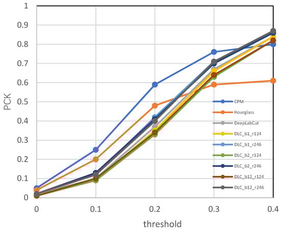 where represents the particular keypoint, is the threshold, is the image, is the Euclidean distance between the predicted and true values of keypoint in the th image, is the scale factor of the pth image, represents the PCK for the keypoint of category under threshold , and represents the average PCK for all keypoints under threshold . In this study, the distance between the ears in each frame was denoted by . If the distance between the ears could not be calculated, the median of the scale could be used as the scale factor—60 cm was 15.29, 70 cm was 12.85, and 80 cm was 10.81. .