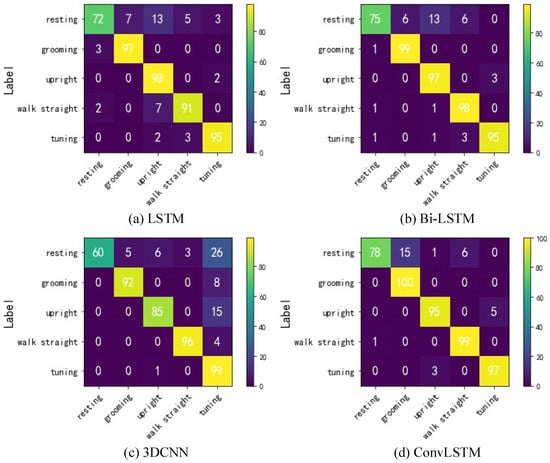 Table 3 compares the recognition accuracy of different algorithms. It is apparent that the algorithms of the long short-term memory network series—such as LSTM, Bi-LSTM, and ConvLSTM—had higher accuracy than 3DCNN. Although 3DCNN can also process time series, its output is only related to the input—not to the order of the input. Thus, it could not handle the time series. Compared with the one-dimensional LSTM network, ConvLSTM achieved the highest accuracy of , indicating that the implicit establishment of spatial temporal information is more conducive to the network’s understanding of behavior. Finally, compared with LSTM, the accuracy of Bi-LSTM was increased by 2.2%, indicating that the context information in the video sequence helped in recognizing behavior. This provides inspiration for the next step to improve the ConvLSTM network. A comparison of behaviors showed that the accuracy of the method in identifying resting was significantly lower than that in identifying the other behaviors. We generated a confusion matrix to analyze identifications by each algorithm to explore the reasons for the low accuracy in identifying resting behavior, as shown in Figure 9.
