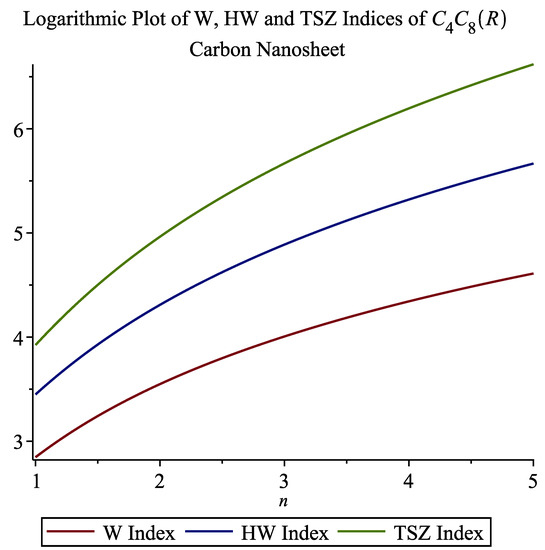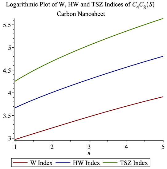 The Figure 3 and Figure 4 exhibit Wiener, hyper Wiener and TSZ indices of and CNS for It is worthy to note that the values at are physical. It is depicted from both the figures that the Wiener index possess low values, the hyper Wiener admits relatively high whereas the TSZ index takes extremely high values for all Moreover, the logarithmic values of the indices for both the nanosheets are different from each other. The nanosheet posess relatively lesser values of the indices as compared to the nanosheet. Thus, for the two atomic configurations, and CNS, all the three indices calculated takes different values and possess different behaviors.