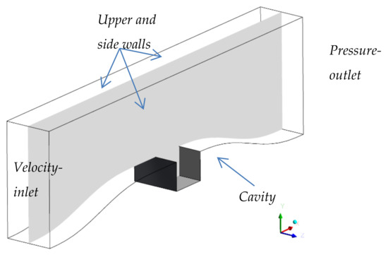 The cavity model considered in this study for comparison between the numerical predictions and water tunnel test results is a scaled rigid model described by Liu and Katz [34]. The numerical model for the pressure–velocity correlation simulation is shown in Figure 1. The L (444.5 mm), W (50.8 mm), and H (120.0 mm) are length, width, and height of the overall model, respectively. A 38.1 mm-long, 50.8 mm-wide, and 30.0 mm-deep cavity is constructed, which is about 190.5 mm from the inlet boundary and 177.8 mm from the outflow boundary. A contraction and a diffusion ramp are arranged along the leading wall and downstream wall of the cavity, which is sketched in Figure 1. The mean velocity above the cavity is about 10 m/s, which corresponds to Reynolds numbers of about 3.4 × 105.
