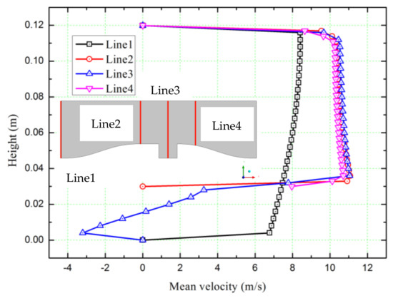 Figure 4 shows the mean streamwise velocity distribution overlapped with the streamlines in the open cavity. There exists an obvious large recirculation region within the cavity. The maximum mean flow velocity is about 3.7 m/s around the recirculation core. Above the recirculation region, there exists a small shear layer with large velocity gradients, the thickness of which is about 3 mm. Above the shear layer, the mean horizontal velocity increases slightly in the horizontal direction due to the contraction of the section area, the growth of the shear layer, and the expansion of the boundary layer on the upper wall.