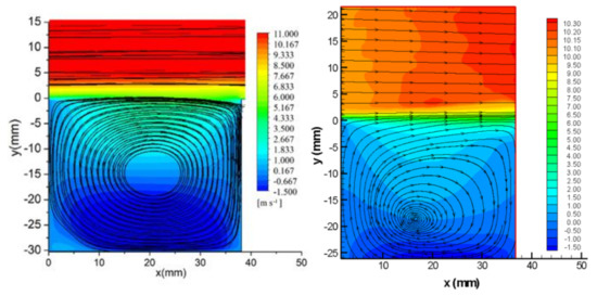 Mean velocity and streamlines of the open cavity (CFD on left, water tunnel on right).