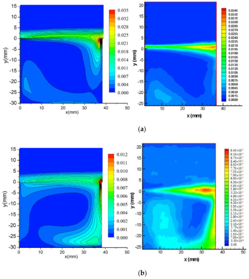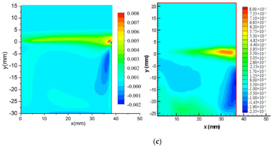 Generally, the pressure–velocity correlations and give similar results to those of the test measurement data, compared with the PIV results. These trends are associated with the adverse mean pressure gradients near the upper corner of the trailing edge of the cavity wall. When the mean velocity increases due to the contraction of the section area, the adverse pressure gradients also increase simultaneously. Then, there exists a positive pressure–velocity correlation. Additionally, this procedure can be found in the Reynolds stress component , which is presented in Figure 5c.