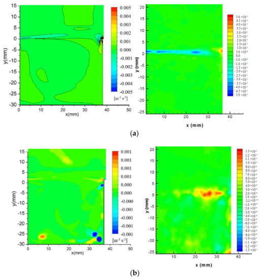 Distributions of and , the pressure–velocity correlations, are presented in Figure 6a,b, respectively. As is obvious, fluctuation velocity and fluctuation pressure are negatively correlated in most parts of the shear layer. This negative correlation explains why the pressure increases with the fluctuation flow velocity decelerating in the streamwise direction and vice versa. As shown in Figure 6a, the component changes its sign from the shear layer to the trailing edge of the cavity. Meanwhile, the value decreases its magnitude to zero gradually, and then increases to a positive value of about 0.005, while for the correlation shown in Figure 6b, fluctuation velocity and fluctuation pressure are positively correlated in most parts of the shear layer. When approaching the trailing edge wall of the cavity, the correlation also changes its sign and magnitude.