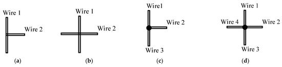 Figure 1. Incorrect (a,b) and correct wire intersections (c,d). - Parallel wires should not be too close to each other. Hence, the distance between the axis of two (or more) wires connected in parallel should exceed their largest radius by more than 4 times;