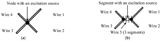 Figure 2. Incorrect (a) and correct (b) setting of the excitation source at the wire intersection. - In most cases, the length of the segments should be less than λ/10, and when describing complex geometric transitions it should be less than λ/20. For large extended wire sections, the length of the segments can be increased, but it should not be less than λ/5. At the same time, using very short segments with a length of less than 0.0001 λ should be avoided;