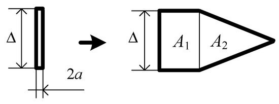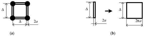 The known equal area rule is based on replacing a square polygon with a grid of wires, the radii of which are based on the size of the polygon [28]. The influence of the wire-grid size constructed considering this rule on the accuracy of the obtained results is investigated in [57]. The rule is generalized to the case of approximation of a surface consisting of square and triangular polygons [33]. The physical interpretation of the equal area rule is given in [58]. According to this rule, to approximate a square polygon with a separate wire, its radius a is determined so that the surface areas of the polygon and a wire length ∆ coincide as in (1) (see Figure 6a) [28].