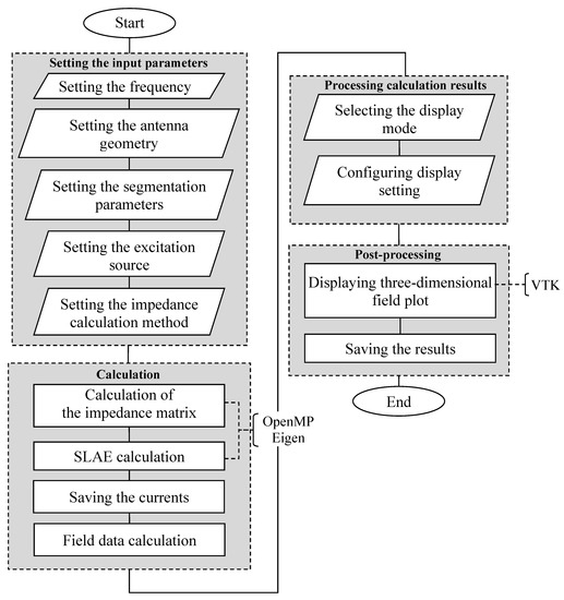 To do this, and based on the wire-grid approximation and the MoM, a program module was developed using C++ programming language with OpenMP, VTK, and Eigen libraries and the QT cross-platform software (Figure 5). This module (further on referred to as the wire-grid) is used to calculate all the obtained results in this work. Moreover, the Octave mathematical package was used to estimate the software implementation of the analytical models used later in this work to validate the results obtained using the wire-grid.
