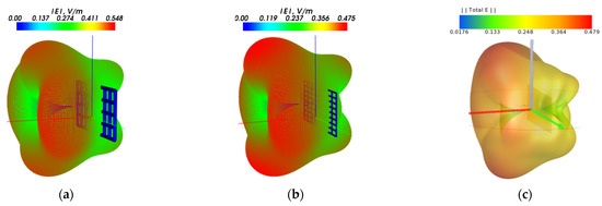 From Figure 7 and Figure 8 it can be seen that the results of EMPro with the wire-grid by (3) agree very well, and the maximum of the electric field strength magnitudes |E| are very close: 0.479 and 0.475 V/m (the difference is less than 1%). When using (1), the maximum |E| was 0.548 V/m (13% difference from EMPro). Thus, one can say that the proposed rule (3) gives more accurate results compared to (1).