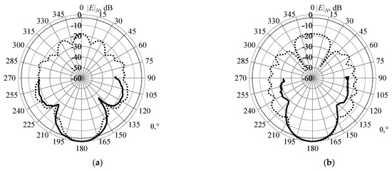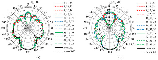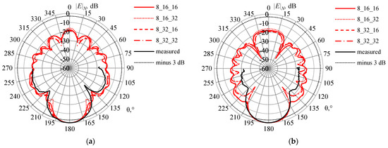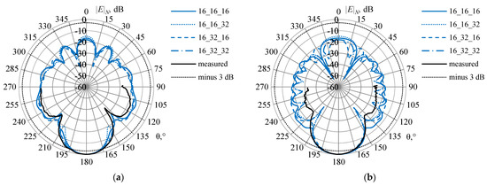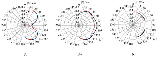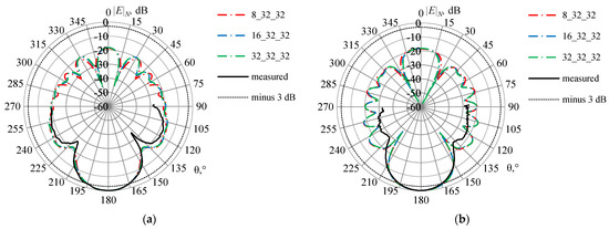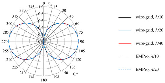 Testing was performed on the example of a dipole oriented along the x axis on a conducting plate 25 × 50 mm2 located on the yz plane. The dipole with a length of 12.5 mm (the length of its shoulders was 5, and the gap was 2.5 mm) and a radius of 0.015 mm was located at a distance of λ/4 from the end of the plate. The excitation frequency was 7.56 GHz (λ ≈ 39.655 mm). The wires with the radii calculated by (1) and (3) were modeled using the wire-grid approximation. The EMPro (FDTD) system [59] was used for verification. The excitation port had the following characteristics: an amplitude of 1 V; an internal resistance of 0 ohms; the signal form was “broadband”. The segment length in both systems was assumed to be λ/10. Using the wire-grid approximation, the plate was approximated by a grid Ly × Lz where Ly and Lz are the step numbers of the grid along the y and z axes. When a square grid was used, these values were assumed to be 8 and 4, respectively (the lengths of the wire segments on both axes were 6.25 mm). According to (1), the radius of the wires a = 0.9947 mm was obtained. At λ/10, the length of the segments was 3.125 mm, which satisfies the conditions in the recommendation 1 and 10 (further on, will be referred to as conditions (1, 10)). As a result, each piece of wire was divided into 2 segments. The total number of segments N was 157. When a rectangular grid was used, Ly = Lz = 8 was assumed (the lengths of the wire segments along the y and z axes were 6.25 and 3.125 mm). The radius of the wires according to (3) was 0.5 mm, and the length of the segments was 3.125 mm, which also satisfies the conditions (1, 10). The wire segments along the y axis were divided into 2 segments and z were not divided; the value of N was 221. The obtained radiation patterns (RP) are shown in Figure 7. At θ = 0, 1, …, 180°, φ = 0°, 45° and 90° (Figure 8).