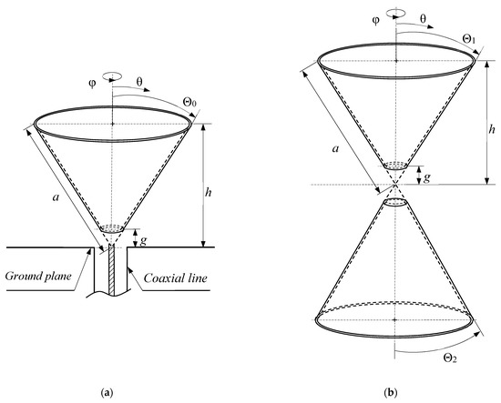 - Papas, C.H.; King, R. Radiation from wide-angle conical antennas fed by a coaxial line. Proc. IRE 1951, 39, 49–51. [Google Scholar] [CrossRef]
