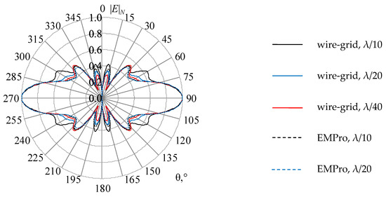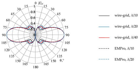 The normalized RP (|E|N, times) of the biconical AE when ka1 = 1.0640 (f1 = 0.1 GHz), calculated analytically [61] and by the wire-grid and EMPro at different mesh sizes.